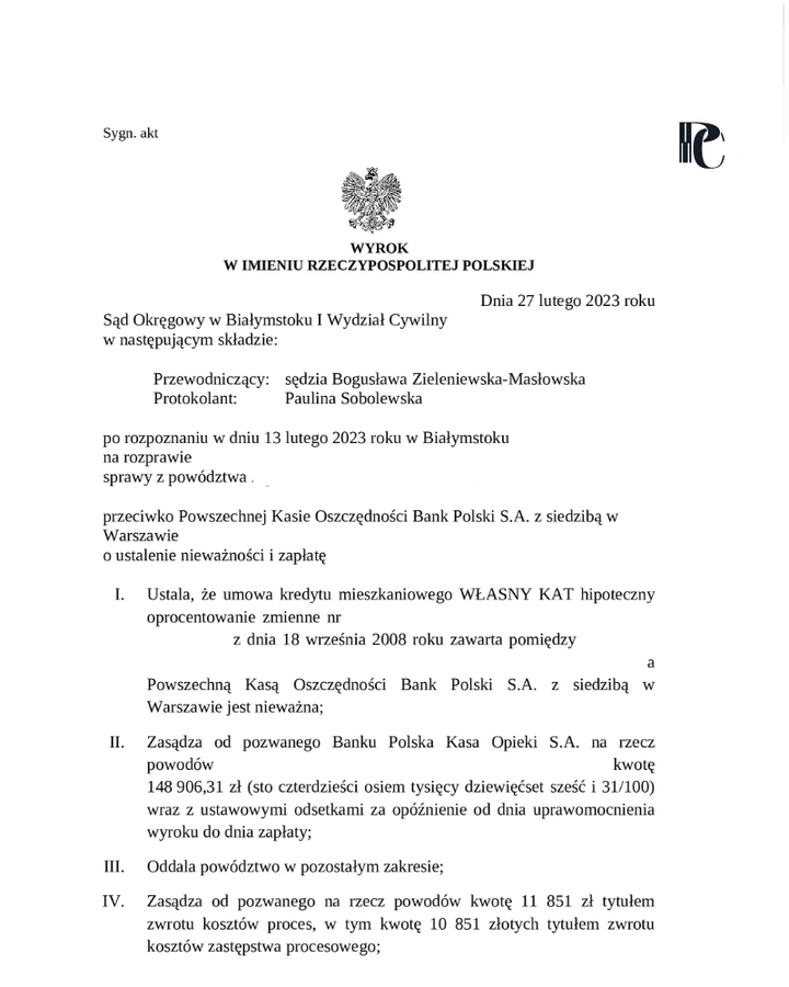 Pierwszy wyrok dotyczył sprawy, która toczyła się prawie dwa lata. Po drodze nawet doświadczyliśmy zmiany składu sędziowskiego… Kredytobiorcy odzyskali wszystkie świadczenia uiszczone na rzecz banku. Gratuluję!
