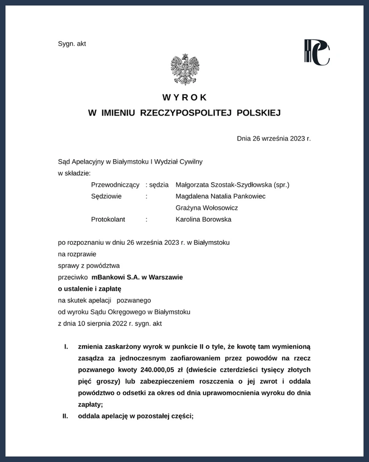 Z wielką radością dzielę się wyrokiem drugiej instancji. Sprawa dotyczyła umowy o kredyt hipoteczny dla osób fizycznych „MULTIPLAN”, która była zawarta w BRE Bank S.A. w Warszawie (obecnie mBank S.A.).
