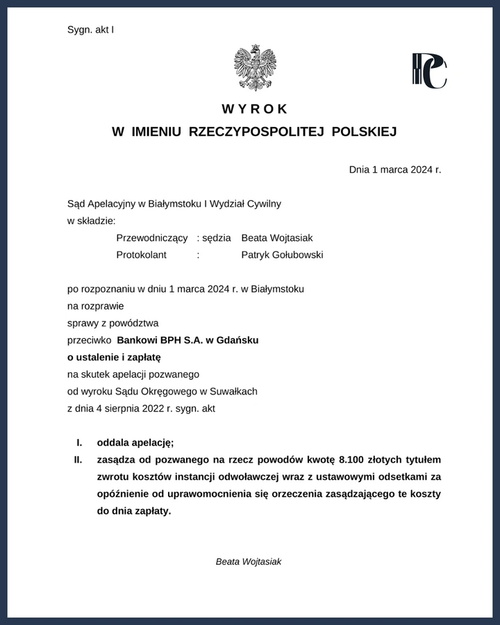 Prawomocny wyrok unieważniający umowę kredytu waloryzowaną do franka szwajcarskiego zawartą z GE Money Bank, czyli z poprzednikiem prawnym BPH S.A.