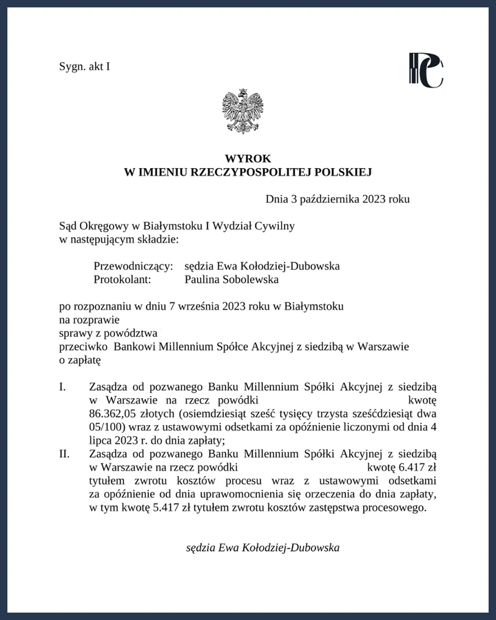 Publikujemy wyrok, w którym sąd zasądził zwrot wszystkich świadczeń (rat kapitałowo – odsetkowych i innych opłat) uiszczonych na rzecz Banku Millenium przez kredytobiorców z powodu abuzywności postanowień umowy kredytu.