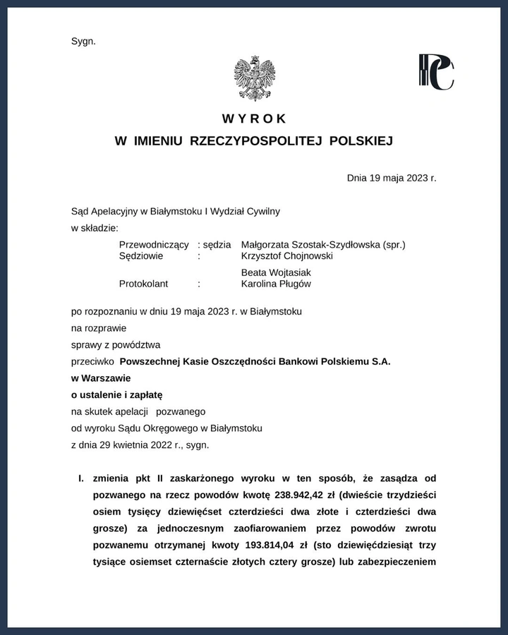Prawomocne unieważnienie umowy kredytu denominowanego zawartej z bankiem PKO BP. Sprawa wpłynęła do Sądu Okręgowego w Białymstoku 30 lipca 2021 r. Tym samym w niecałe dwa lata Kredytobiorcy unieważnili swoją umowę i już nie muszą spłacać kredytu. Umowa przestała istnieć.
